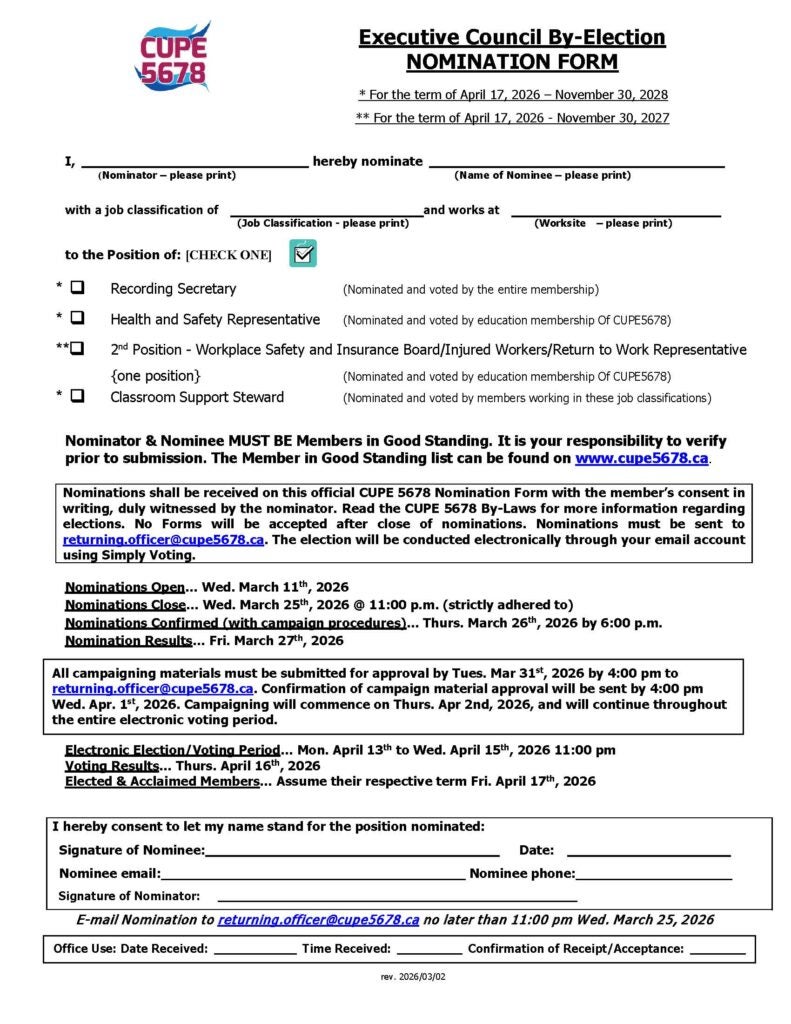 On behalf of By-Election Committee Chair Kayla Miller, the by-election nomination form for four (4) available positions is available.